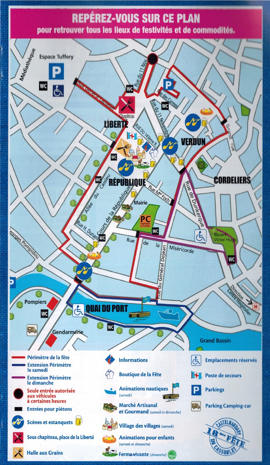 Les repas, les concerts gratuits, les spectacles, les OFNIS sur le canal, le Marché artisanal, les expos., le GRAND CORSO FLEURI du dimanche... Concerts COLLECTIF METISSE, ANGGUN, AXEL BAUER, ROBERDAM, YCARE, WILL BARBER, ORCHESTRES... | cette année participez à la 9ème édition de "La Ronde du Cassoulet". Organisateur Industeam au 04.68.23.54.84 | Comment se rendre à la Fête ? Où se garer ? Où se restaurer ? Où loger ? Tous les soirs concerts jusqu'à 2 h du matin sur toutes les places et jusqu'à 3 h en centre ville place de la république. |
